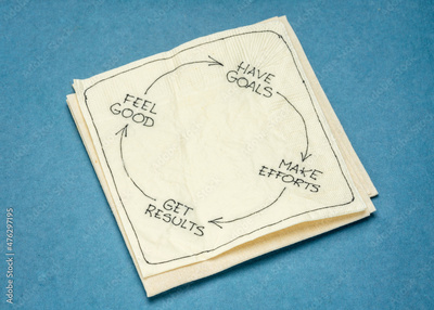 success or happiness cycle concept - have goals, make efforts, get results, feel good - napkin doodle against blue rag paper
