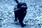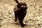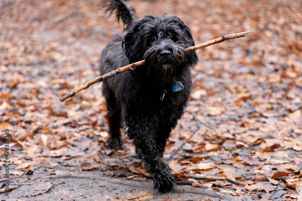 A young black labradoodle dog is retrieving a stick. Walking the dog in a forest with autumn colors and leaves on the ground