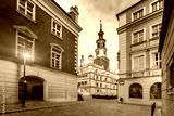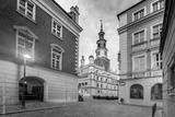 Empty street and Poznan Town Hall in Old Town at sunrise, Poznan, Poland