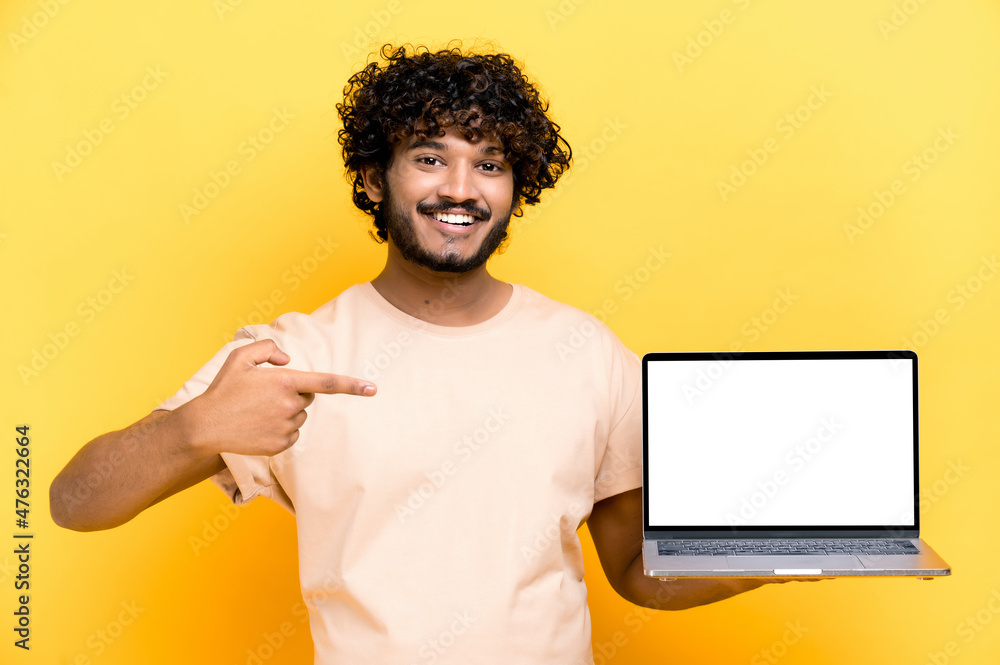 Satisfied positive modern indian curly-haired guy, holds an open laptop with blank white screen, points finger at it, standing on isolated orange background, smiling friendly. Mock-up, copy space