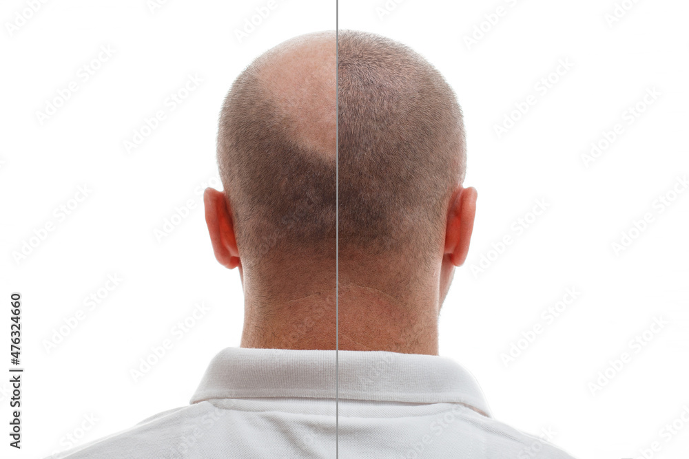 The head of a balding man before and after hair transplant surgery. A man losing his hair has become shaggy. An advertising poster for a hair transplant clinic. Treatment of baldness.