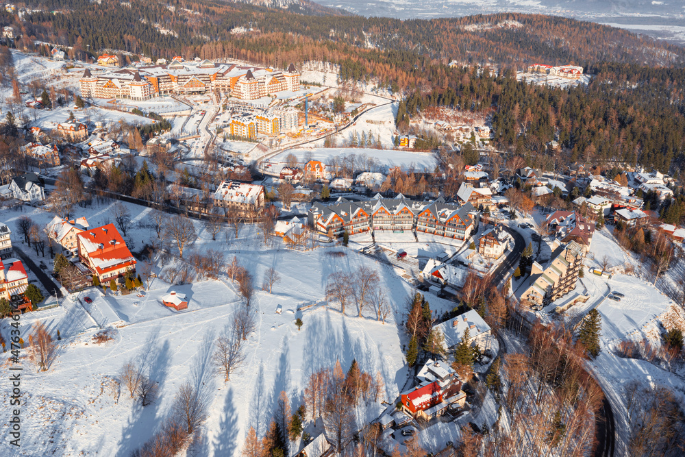 Winter city among the forest in the mountains. View of the winter landscape from a drone. Karpacz. Poland