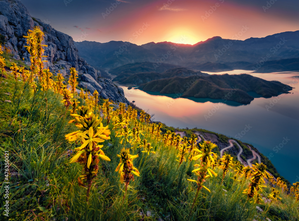 Unbelievable sunrise on Bovilla Lake, near Tirana city located. Magnificent spring landscape with blooming yellow flowers. Fabulous outdor scene of Albania. Beauty of nature concept background.