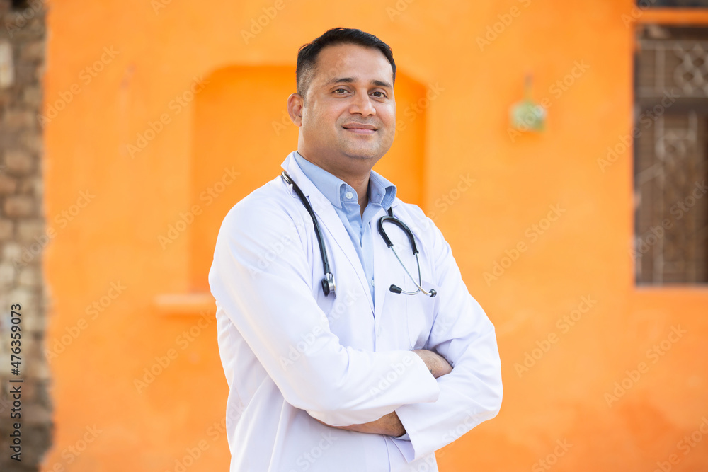 Portrait Of Young Smiling indian Male Doctor Wearing Stethoscope Standing Cross Arms, He is looking at camera with positive emotions against orange background. healthcare and medical concept.