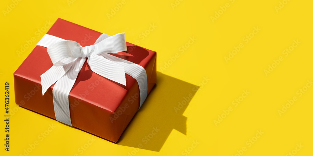 Red gift box tied with white ribbon on isolated on yellow background. Present box with white bow and ribbons. High Angle View Of Christmas Present Over yellow background. Holiday concept, wide banner