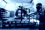 Worker painting car parts in a paint box