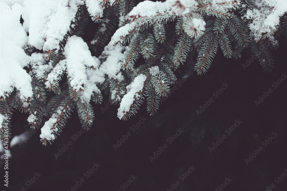 Beautiful Christmas Background with snow covered gray fir tree brunch close up. Copy space, trendy moody dark grey toned design. Vintage December wallpaper. Natural winter holiday forest backdrop
