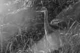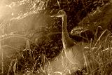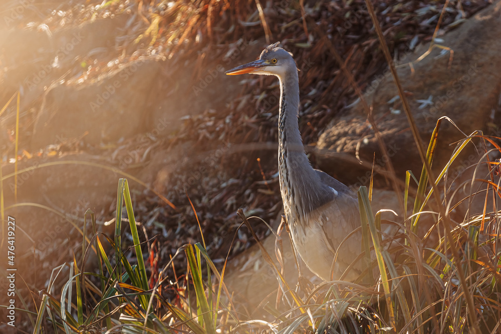 grey heron (Ardea cinerea) standing on the bank of the reservoir in the backlight