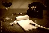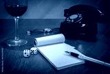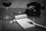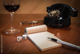 still life - old telephone, notebook, ink pen, wristwatch, dice, glass of wine. still life