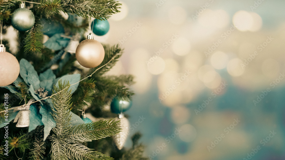 Close-up of Christmas tree decorated with Christmas bauble and bokeh background, vintage tone horizontal view.