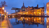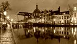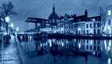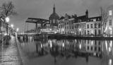 Panorama of Leiden Oude Vest canal with Marekerk church and Marebrug bridge, South Holland, Netherlands