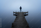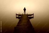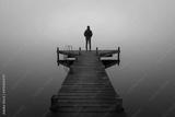 A man looking over a lake from a jetty on a foggy, autumn day.