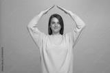 Life insurance. Positive young girl show house roof gesture overhead feeling herself in safety on yellow background