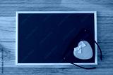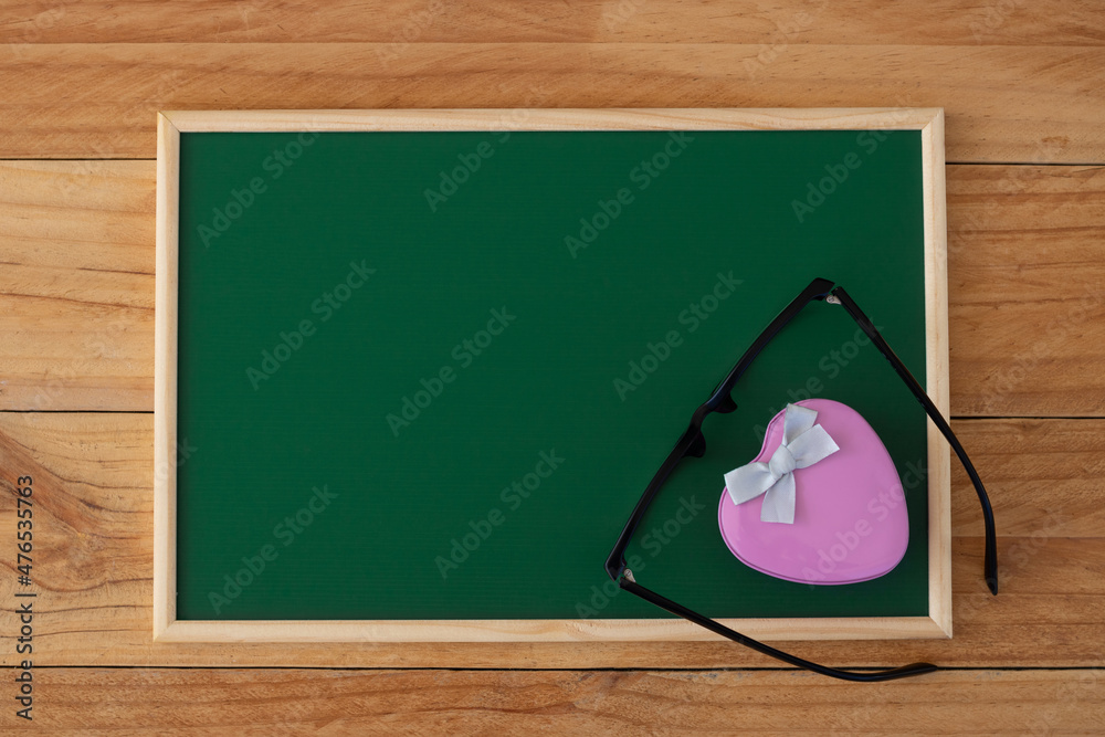 The pink heart-shaped box is decorated with ribbon and black eyeglasses on a green chalkboard. Top-view composition.