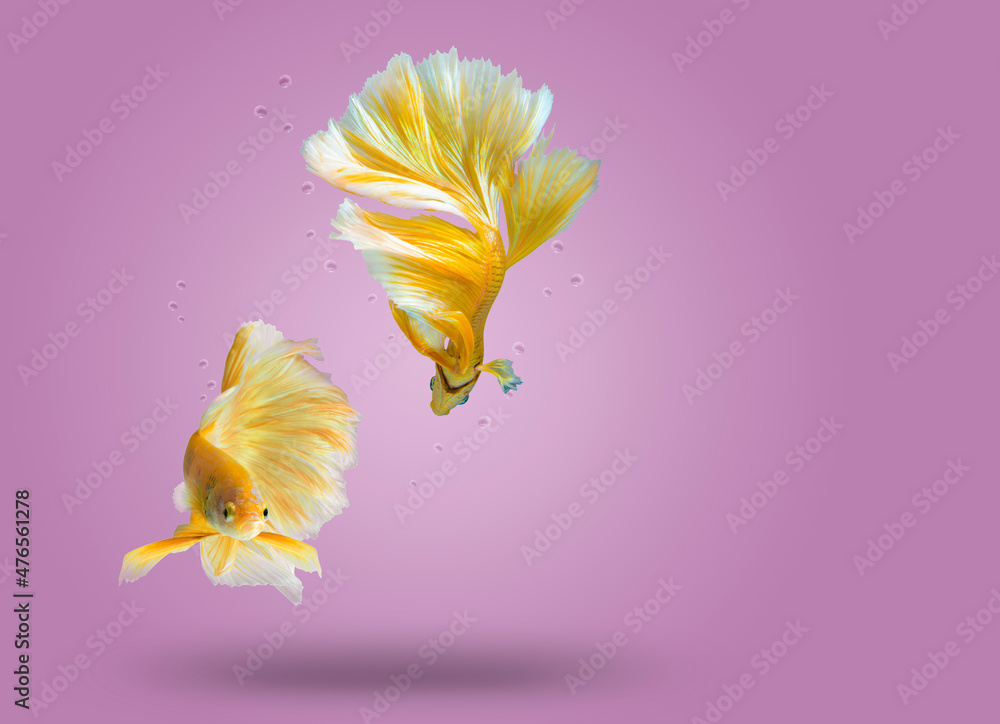 Siamese fighting fish or Rosetail half moon fancy, Yellow fighting fish,Betta splendens,on purple background.