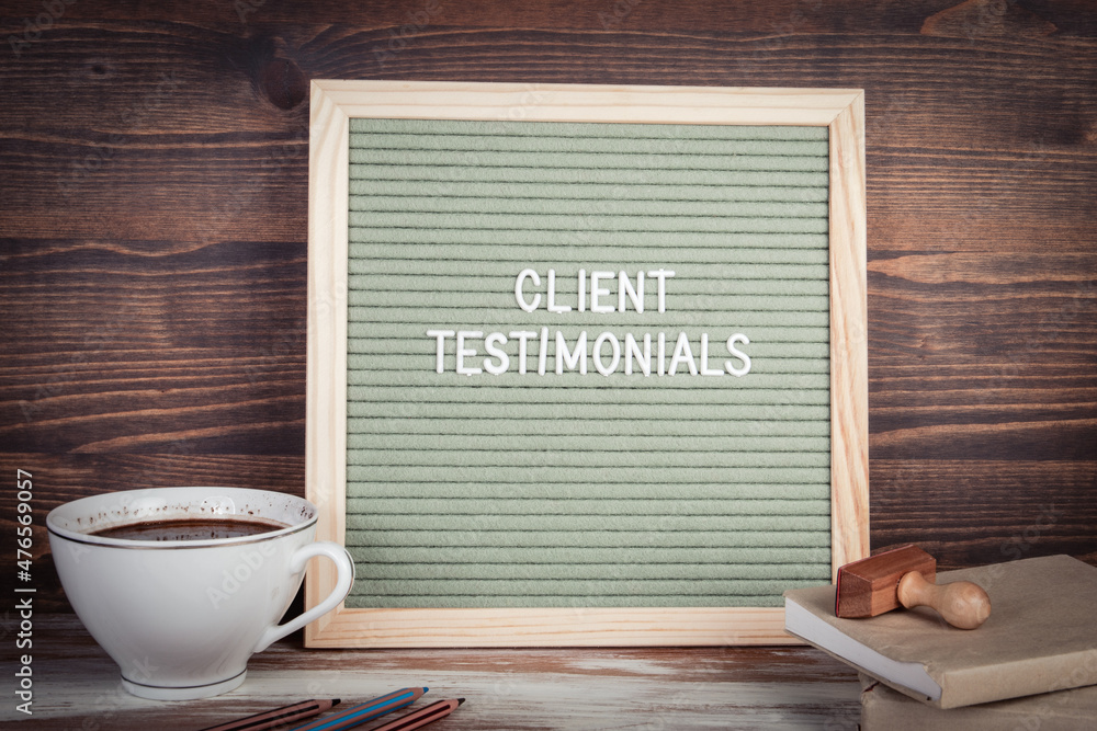Client Testimonials. English text on a letter Board. Stationery on a wooden table