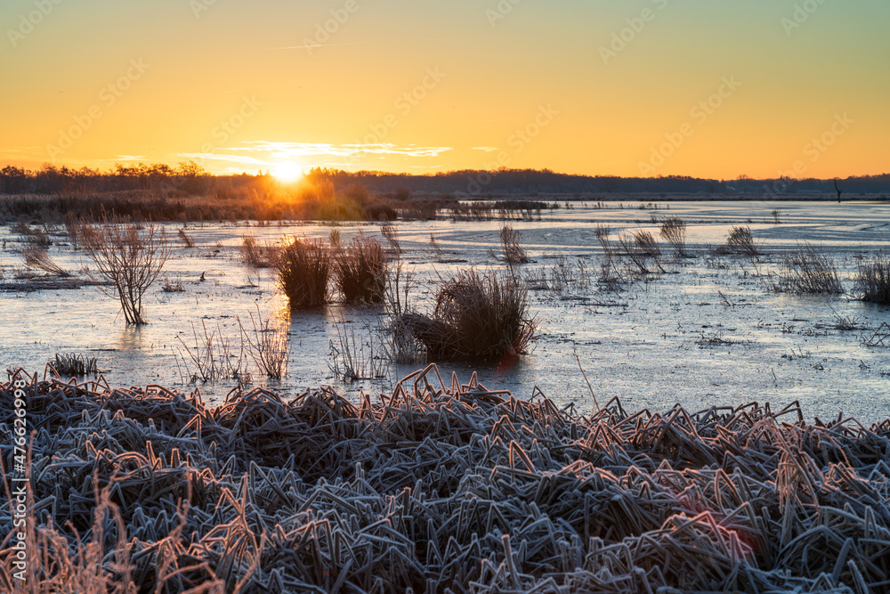 Warm sunlight on a frozen field of reed on a cold winter morning.