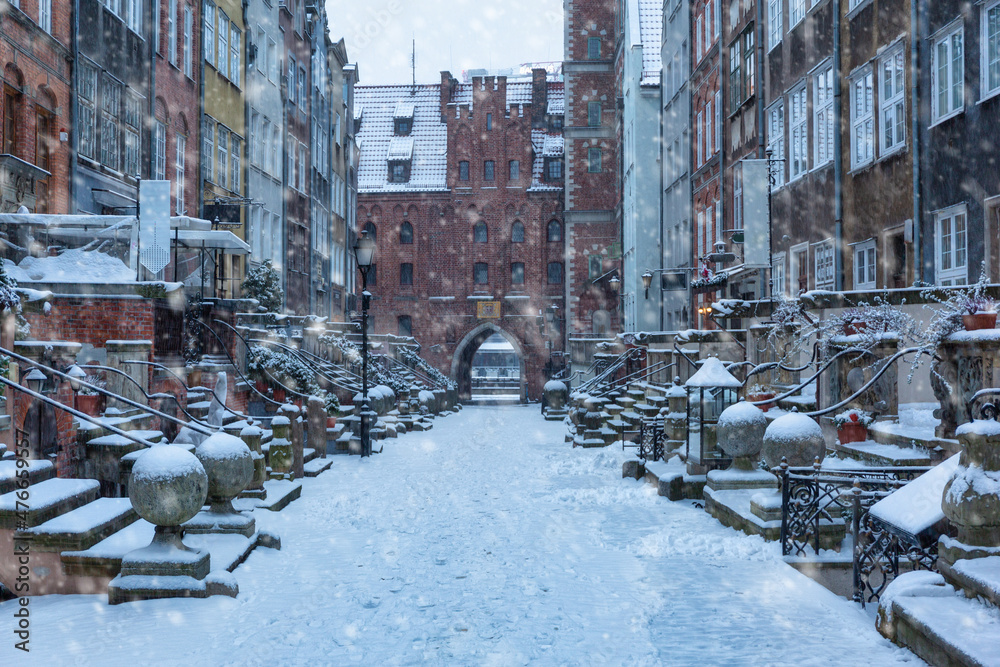 Beautiful Mariacka street in Gdansk at snowy winter, Poland