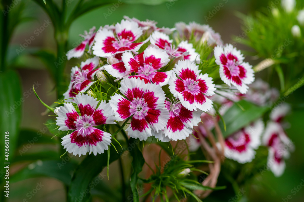 Dianthus barbatus beautiful ornamental flowering plants, group of bright pink purple white flowers in bloom