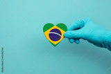 Medical workers hand wearing surgical glove holding Brazil flag heart