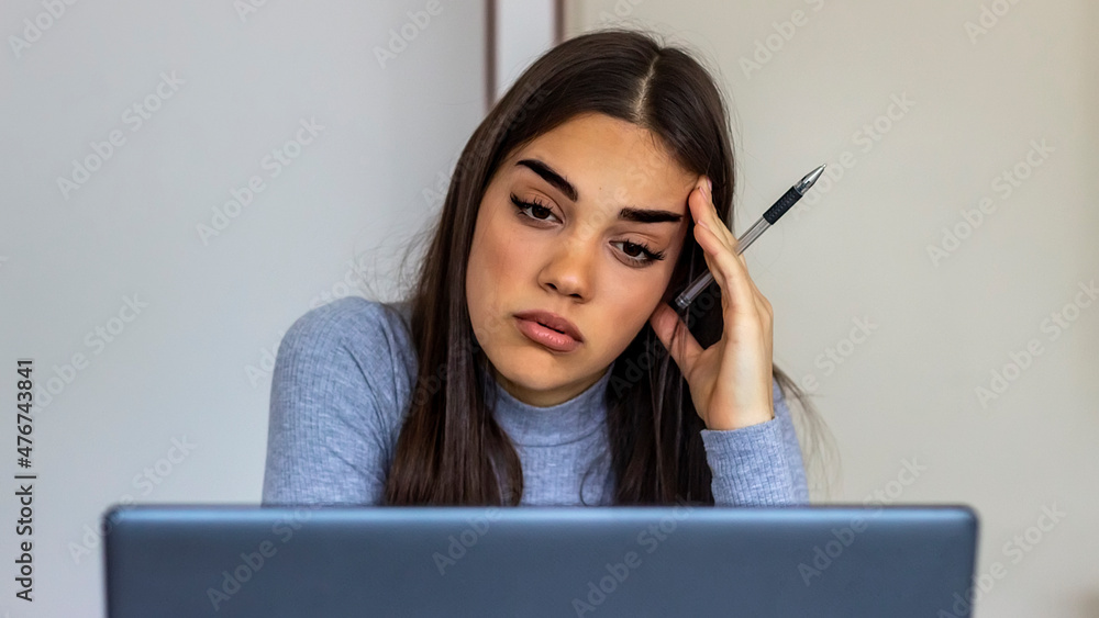 Thoughtful young woman looking away feeling bored pensive, thinking of problem solution in her home office with laptop. Caucasian female sitting at table looking at computer screen feels unmotivated.