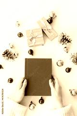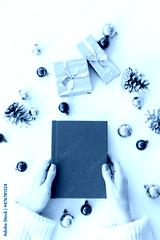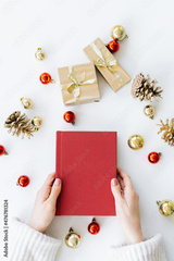 a red book in the hands of a young girl against the background of gifts and Christmas toys. the concept of Christmas