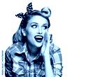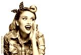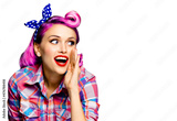 Portrait of pinup woman holding hand near open mouth, looking outside and saying something. Girl dressed in pin up style. Red purple haired model at retro fashion vintage concept, isolated over white.