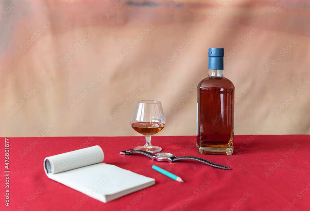 Bottle, glass, wrist watch, notebook, pencil. Red tablecloth, brown background