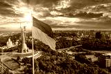 Aerial view of the Ukrainian flag waving in the wind against the city of Kyiv, Ukraine near the famous statue of Motherland.
