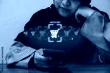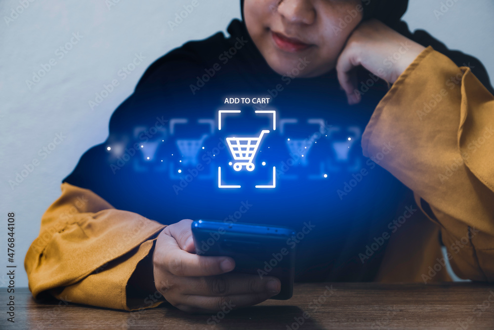 Online shopping concept. Hijabi women add to cart of a product through a mobile phone.