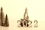 Concept new year 2022,excavator of lift up bucket that is installing the number zero , two letters in Festival and christmas tree on white background