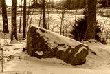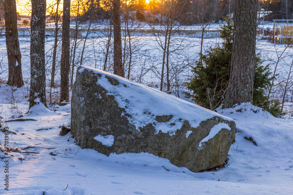 Beautiful winter view of rocky nature landscape in forest. Sweden.