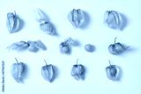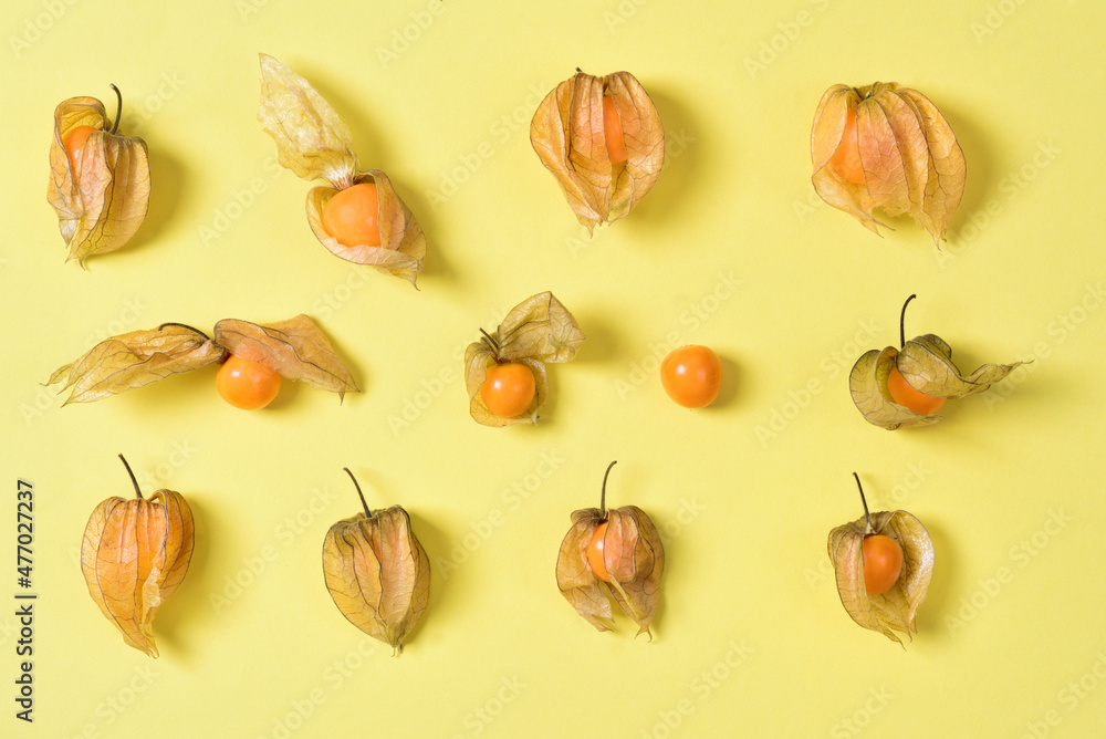 Several ripe physalis (Cape gooseberries) lie next to each other and form a texture against a yellow background