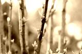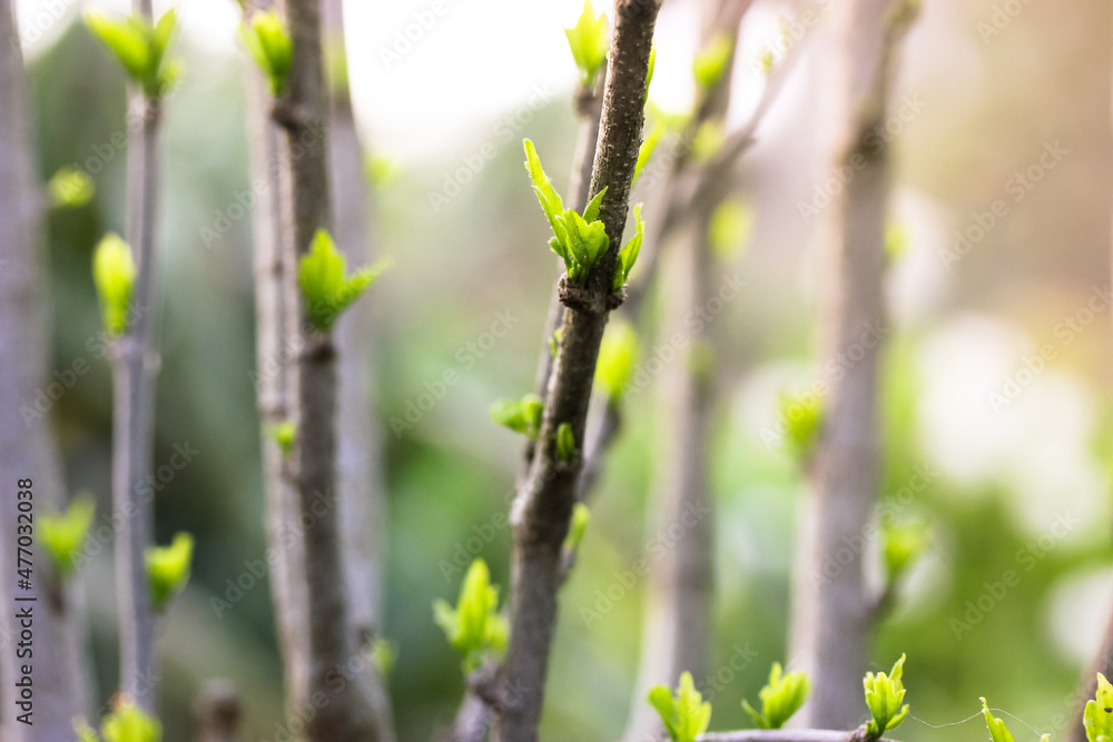 Small young green leaves, buds on the branches of bushes, trees in the spring botanical garden, blurry background. Nature awakening to life after winter. Thin twigs in natural light. Selective focus.