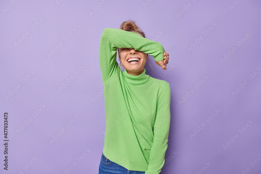 Positive young woman covers eyes with arm smiles broadly giggles happily waits for surprise wears green turtleneck isolated over purple background. Happy human emotions and feelings concept.