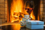 Gift box and a glass of wine near cozy fireplace, in country house.