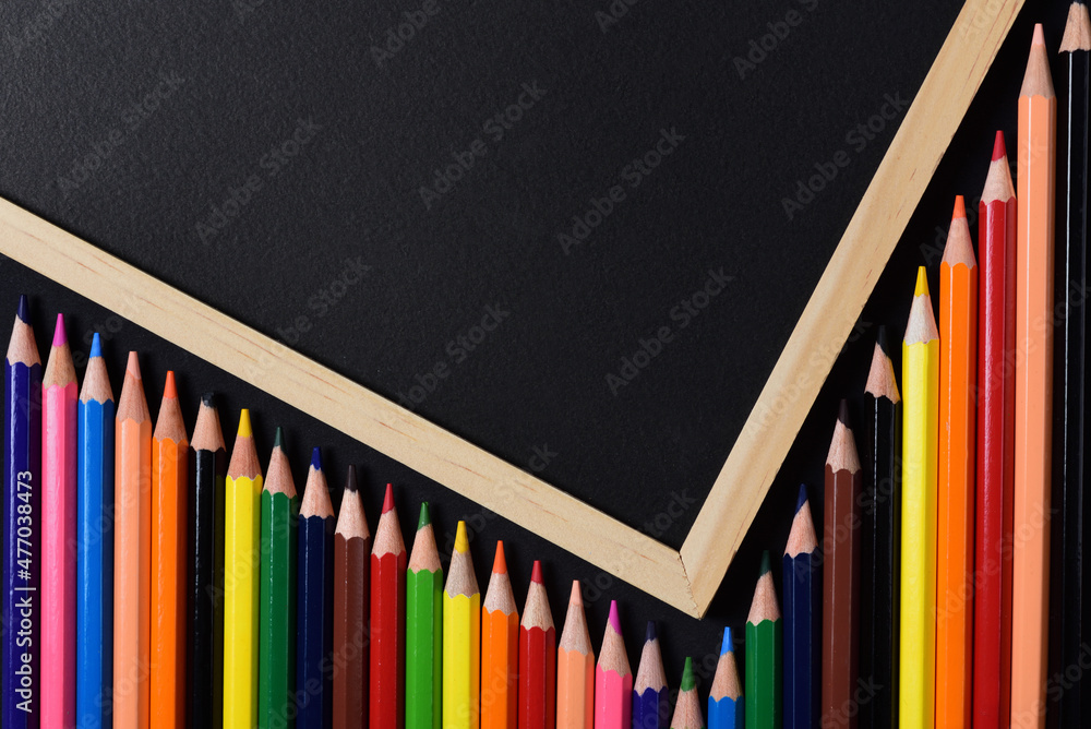 Close up of many wooden crayons in different colors lying under a dark blackboard with a wooden frame creating an outline with space for text