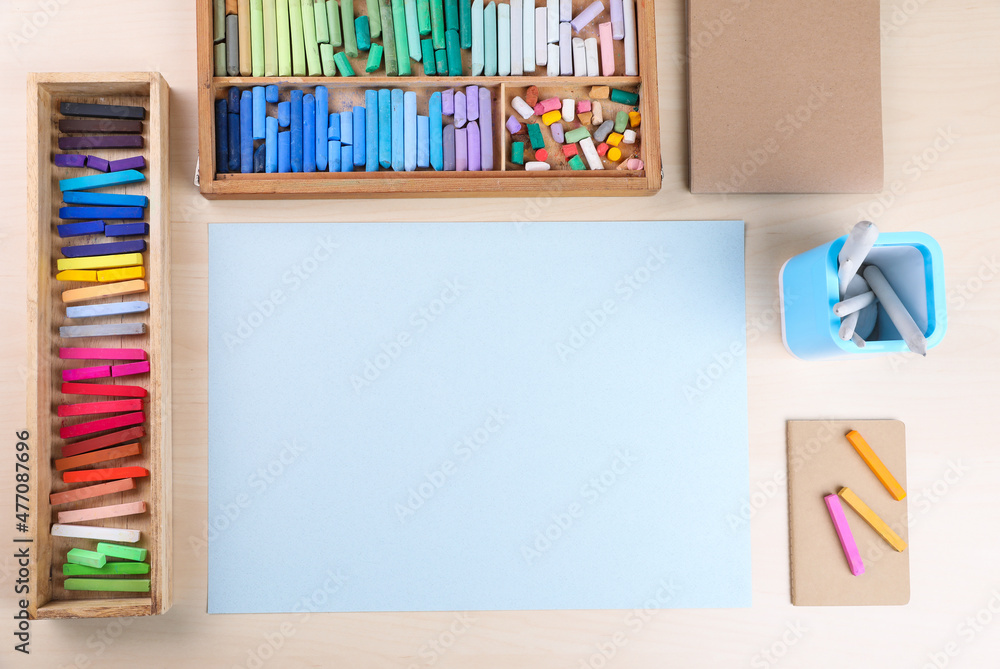 Layout with blank paper, soft pastels and other drawing supplies on wooden table at artist's workplace, top view. Space for design