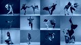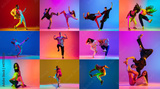 Collage of young people dancing hip hop isolated over multicolored background in neon lights