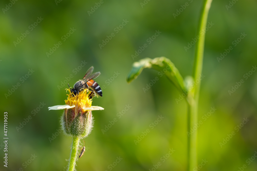 Yellow Bee collecting pollen at yellow flower flower on green natural garden Blur background, Bee flying over the yellow flower in blur background