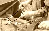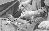 A close up of hands of surgeons team during operation gall bladder stone removal with surgical laparoscopy instruments. Key hold surgery in cholecystitis with abdominal pain.