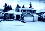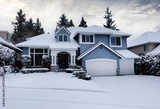 Snowflakes falling on snowy suburban home and lawn with snow in forefront
