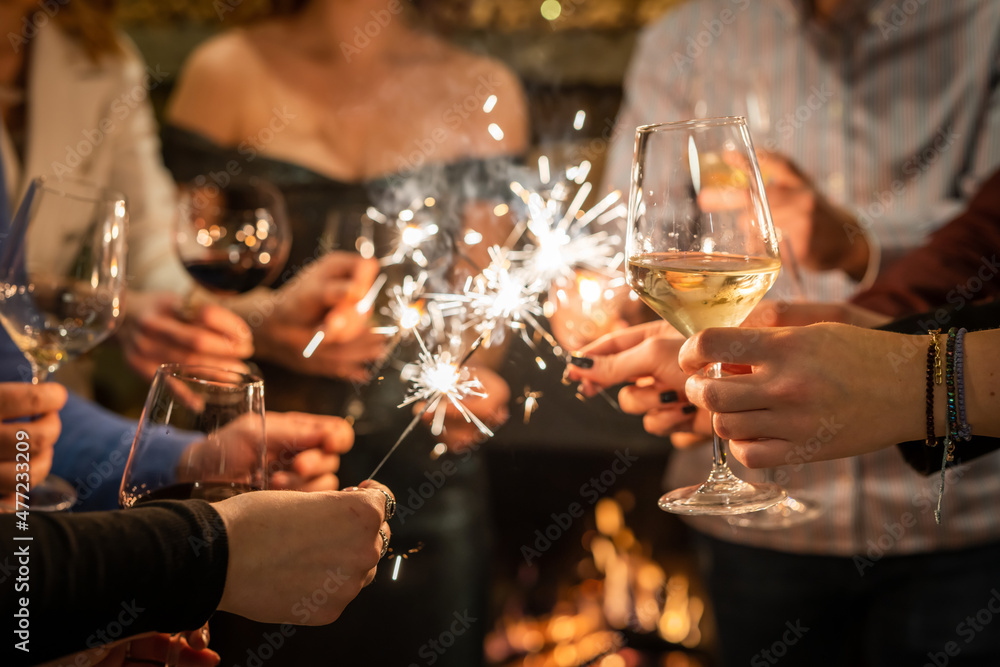 Close up on hands of group of people holding glasses of wine and sparkles while toasting and celebrating indoor focus on glass of wine birthday or new year celebration concept