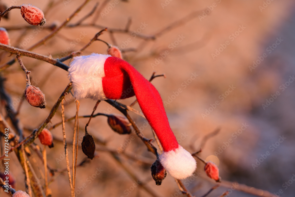 A forgotten red pointed cap from St. Nicholas hangs on a frosty rose hip bush at sunrise