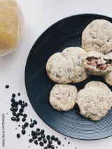 Chocolate chip cookies in a black plate on white table with coffee grains. Flat-lay. Morning. Food. Eating. Cookie. View from above