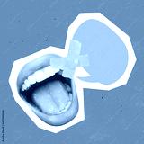 Modern design, contemporary art collage. Inspiration, idea, trendy urban magazine style. Open mouth and speech bubble with finger tape