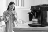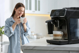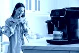 Young woman enjoying fresh aromatic coffee in kitchen, focus on modern machine