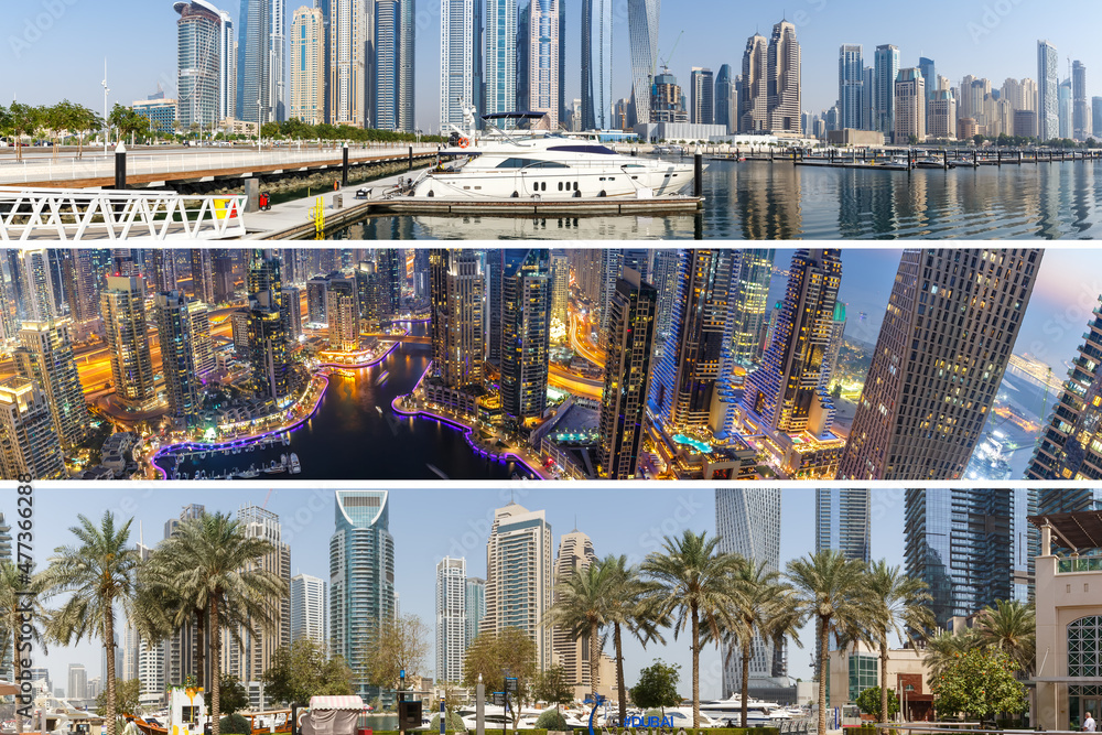 Dubai Marina and Harbour collage collection skyline architecture wealth luxury travel in United Arab Emirates