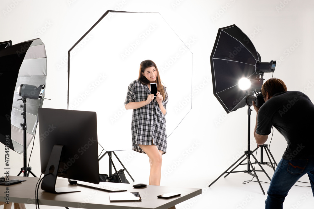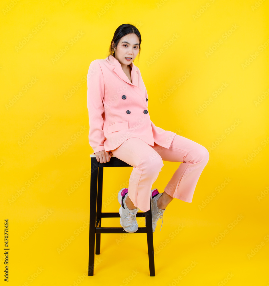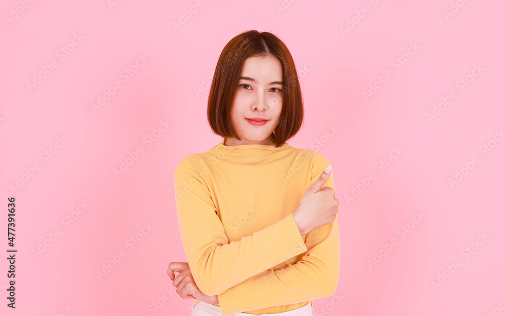 Portrait studio cutout shot of Asian young pretty short hair female model in yellow long sleeve shirt stand smile to look at the camera and pointing finger on pink background.