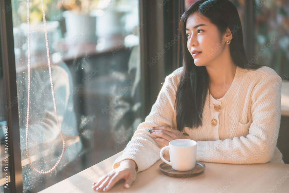 Portrait beautiful young asian woman girl wearing warm clothes enjoys drinking holding of positive the having cup of coffee,milk or chocolate at house home in the living room inside or cafe